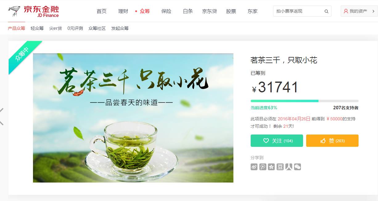 京東小花茶眾籌活動已經上線5天了,在眾多關注小花茶支持小花茶的行動中,眾籌也取得了非常好的成績。上線短短幾天,項目進度便完成了63%,200多人參與了眾籌,籌集了3萬多的資金。目前眾籌活動還剩下21天,在支持與回報的投資上消費者依舊有很多的選擇,項目發起人希望有更多的人能夠參與到活動中,在大家的支持下完成眾籌任務,和大家共同分享桐城小花茶的沁人香甜。雖然眾籌預售的利潤率不如線下門店銷售利潤率高,但通過眾籌能在無形中擴大產品知名度,也是在“互聯網+”大趨勢下的新戰略,這種新的商業模式是傳統產業的新方向。實現產業的轉化不僅僅是茶農們的期待,也是項目發起人的愿望。