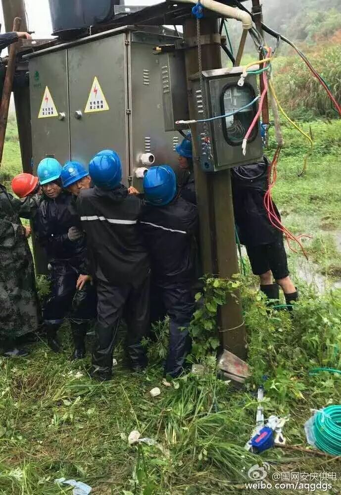 7月5日上午,因為大雨沖毀當地道路,車輛無法到達,國網桐城市供電公司青草供電所員工搶修山區配電設施時,全靠人工搬運安裝。